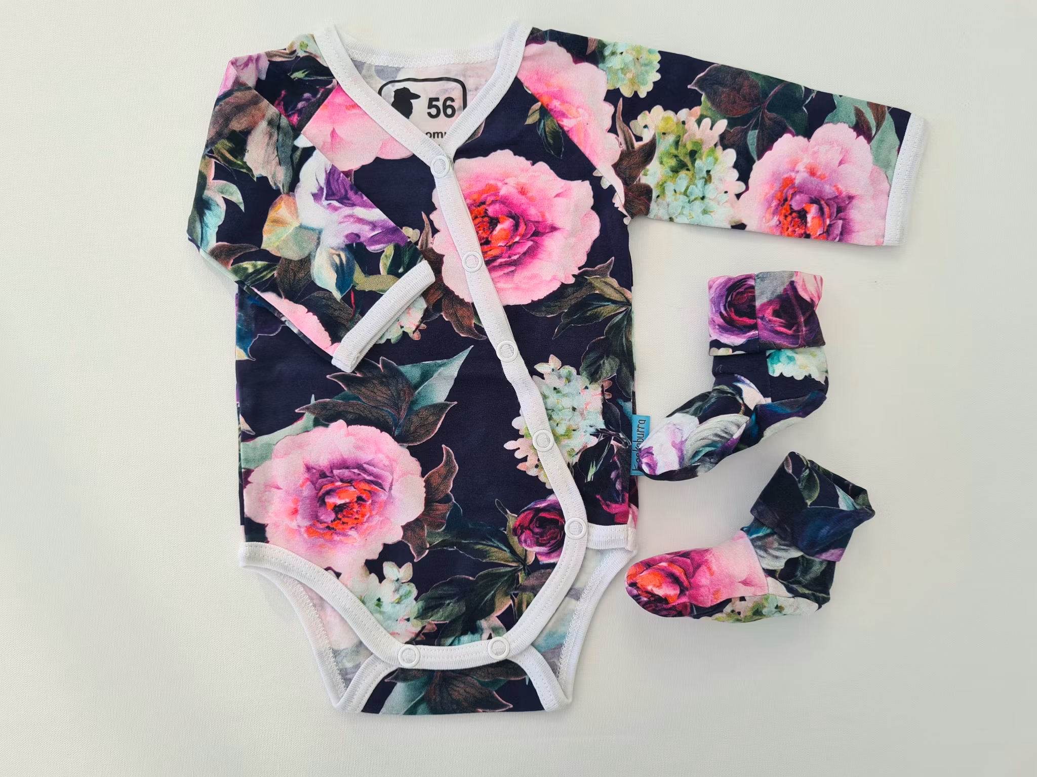 Fuskomlottbody Pioner strl 56 250 kr Fuskomlottbody med Pioner och Hortensia. Ett par tossor medföljer på köpet. I lager Lägg i korgen Produktbeskrivning Recensioner Fuskomlottbody med Pioner och Hortensia.Storlek 56.Ett par tossor medföljer på köpet om kunden vill. Dom är inte utprovade så storleken är något osäker.Helt öppningsbar fram för att undvika att plagget dras över barnets huvud. Så kallad fuskomlott som innebär att framstyckets delar möts vid knäppningen, d.v.s. inga dubbla tygstycken på bröstkorgen.Sydd på overlock- och coverlockmaskiner för professionella och hållbara sömmar. Tygerna är tvättade med parfymfritt tvättmedel innan sömnad. Detta för att undvika krympning, färgning och eventuellt vridning av plagget. Mjukt och skonsamt tyg tillverkat av 95% bomull och 5% elastan.Tvättråd maskintvätt 40°C, ej torktumling.