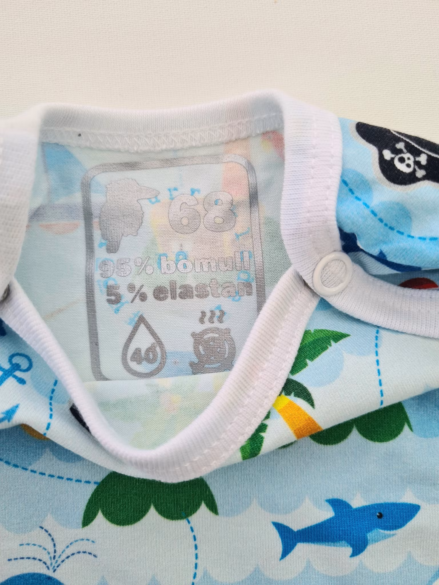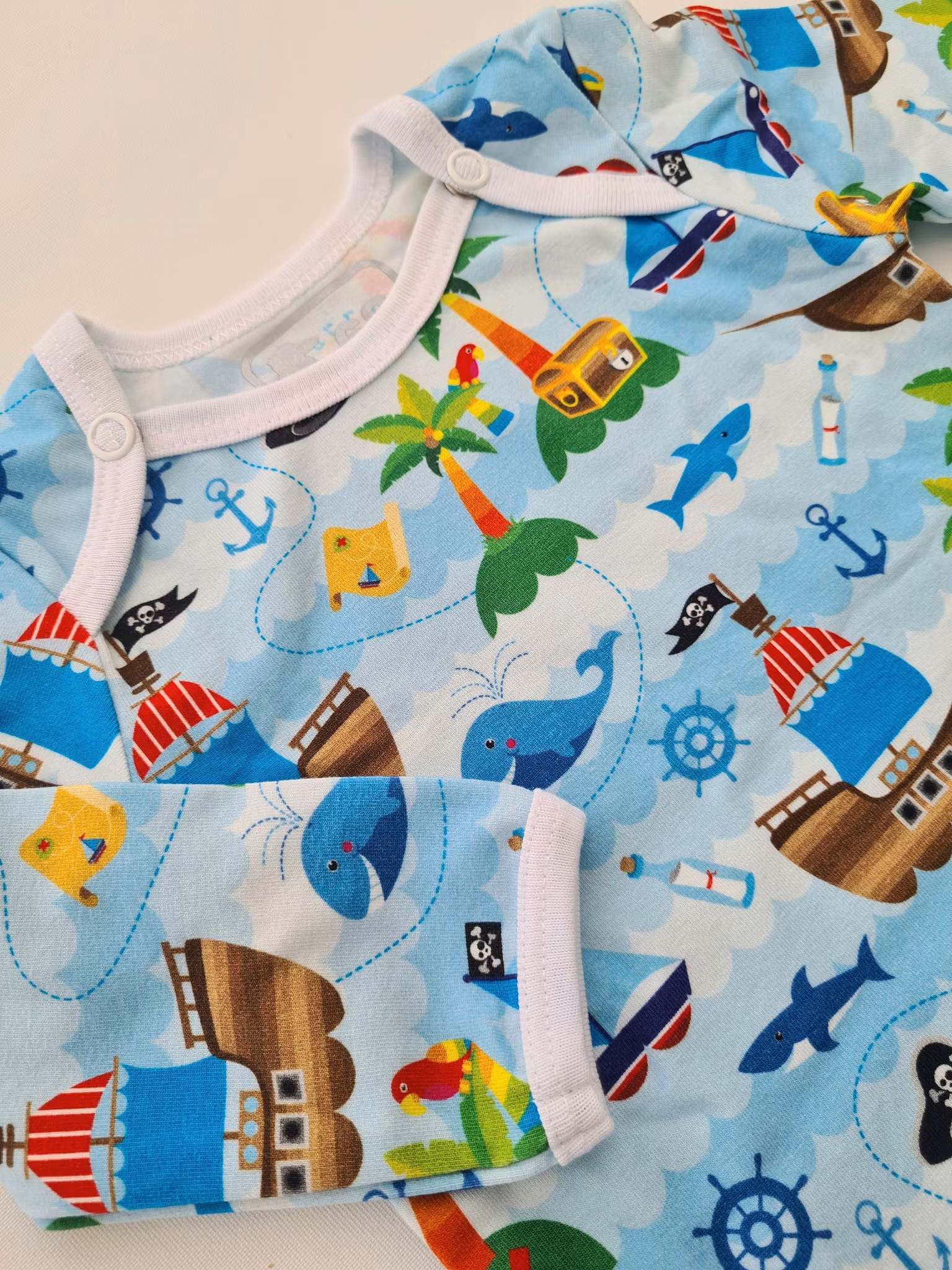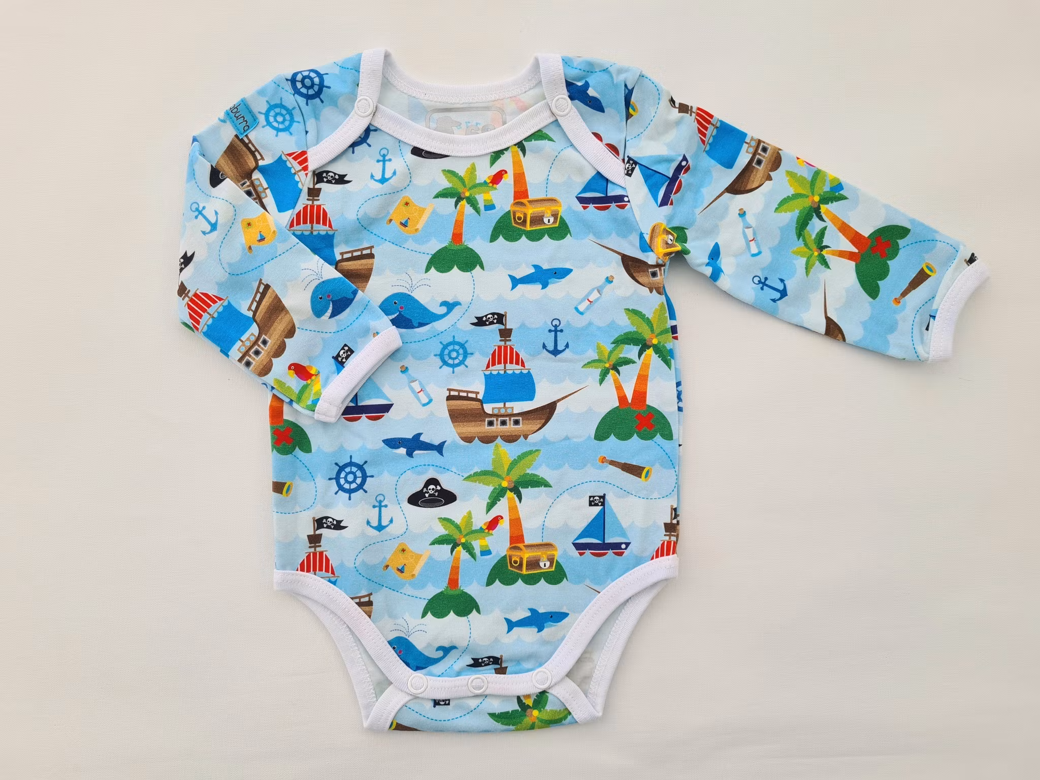 Kuvertbody Pirater strl 68, 2:a sortering 200 kr Kuvertbody med piratskepp och skattkistor. Sydd på overlock- och coverlockmaskiner för professionella och hållbara sömmar. I lager Lägg i korgen Produktbeskrivning Recensioner Kuvertbody med Pirattema.Storlek 68.På nackens insida finns dubbla tryck p.g.a. byte av märkningsmetod (se bild).Sydd på overlock- och coverlockmaskiner för professionella och hållbara sömmar. Tygerna är tvättade med parfymfritt tvättmedel innan sömnad. Detta för att undvika krympning, färgning och eventuellt vridning av plagget.Mjukt och skonsamt tyg tillverkat av 95% bomull och 5% elastan.Tvättråd maskintvätt 40°C, ej torktumling.GOTS-certifierad bomull.
